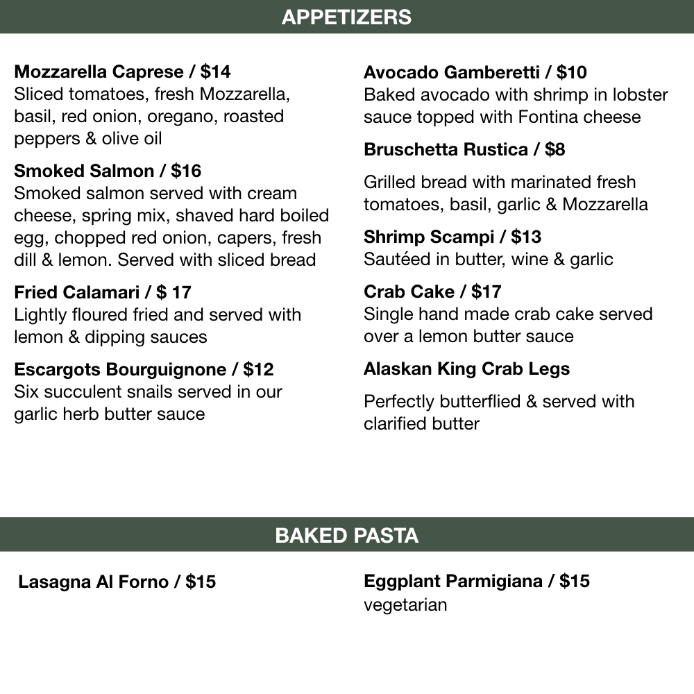 - Appetizers: Start your meal with classics like fried calamari and burrata caprese, perfect for sharing.